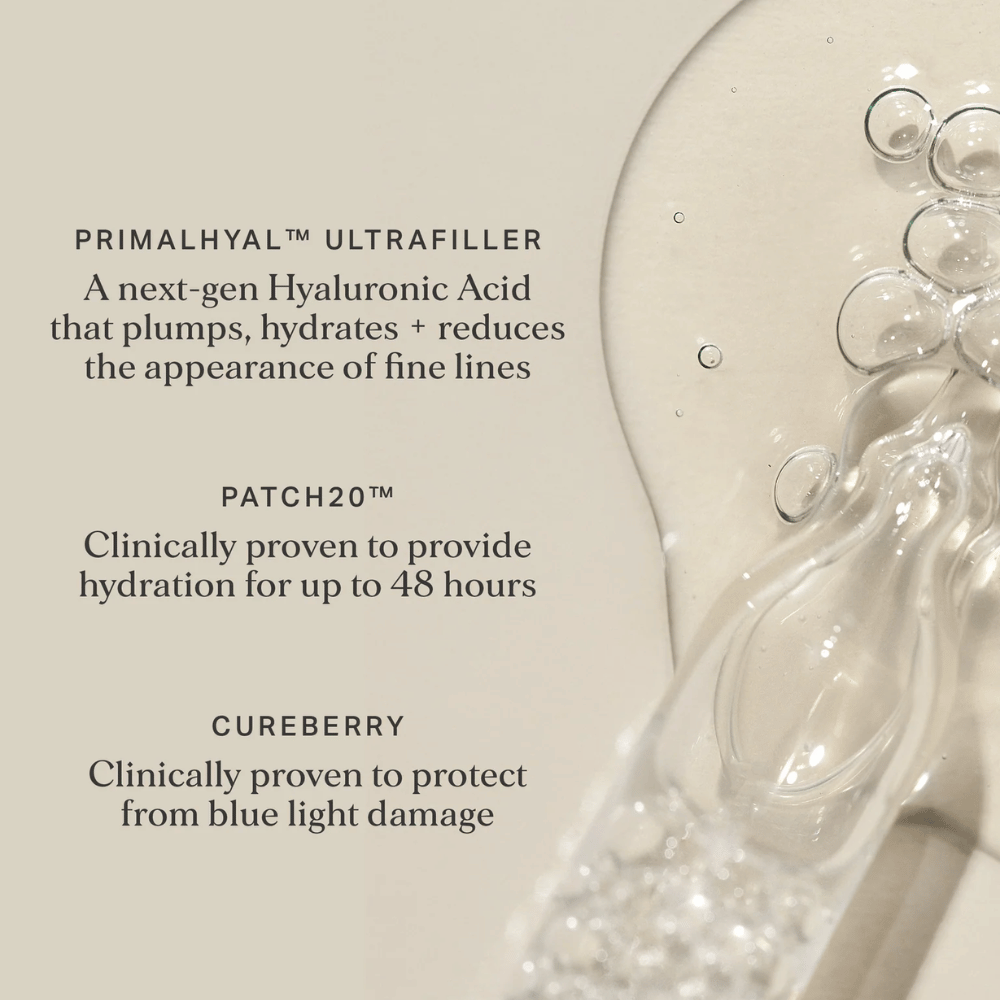 Primalhyal Ultrafiller binds moisture to plump and protect existing collagen stores, whilst Hyaluronic Acids works to reduce the appearance of fine lines and enhance radiance.