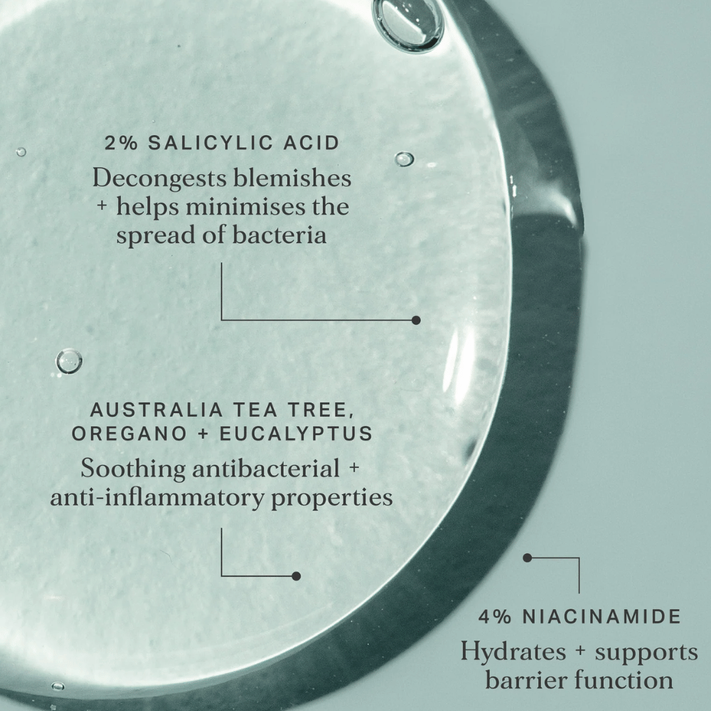 Fast-acting formula with 2% Salicylic Acid decongests blemishes, helps minimises the spread of bacteria and calm inflamed blemishes.