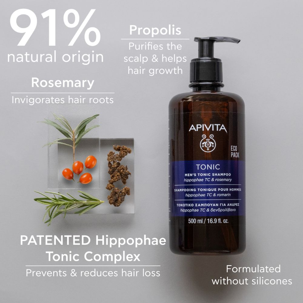 APIVITA Tonic Hair Care Men's Tonic Shampoo is a shampoo that boosts hair growth while prolonging the lifespan of the hair. Formulated with a unique blend of organic hippophae and rosemary extracts, this shampoo provides multiple benefits to the hair. It restores health to the scalp and promotes micro-circulation, all the while regulating sebum production, so your hair is able to grow in optimal scalp conditions. Moreover, this shampoo contributes to boost the density and volume of the hair, thus restoring a healthy and youthful appearance. In clinical trials, 84% of men found this shampoo toned their hair and scalp; 72% reported an improvement in the appearance of their hair loss; 72% agreed their hair was denser and stronger.