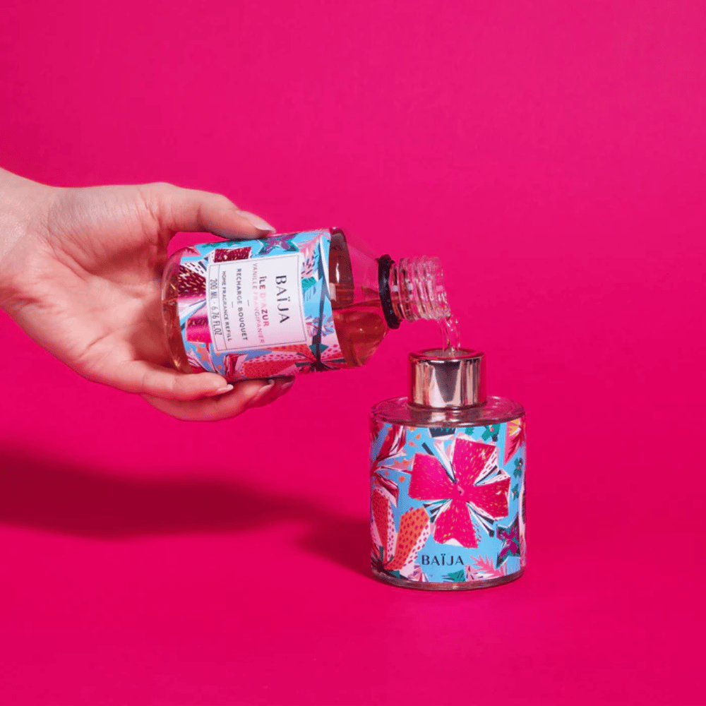 - Gently remove the cap and slowly pour the perfume into the bottle holding the rattan sticks.