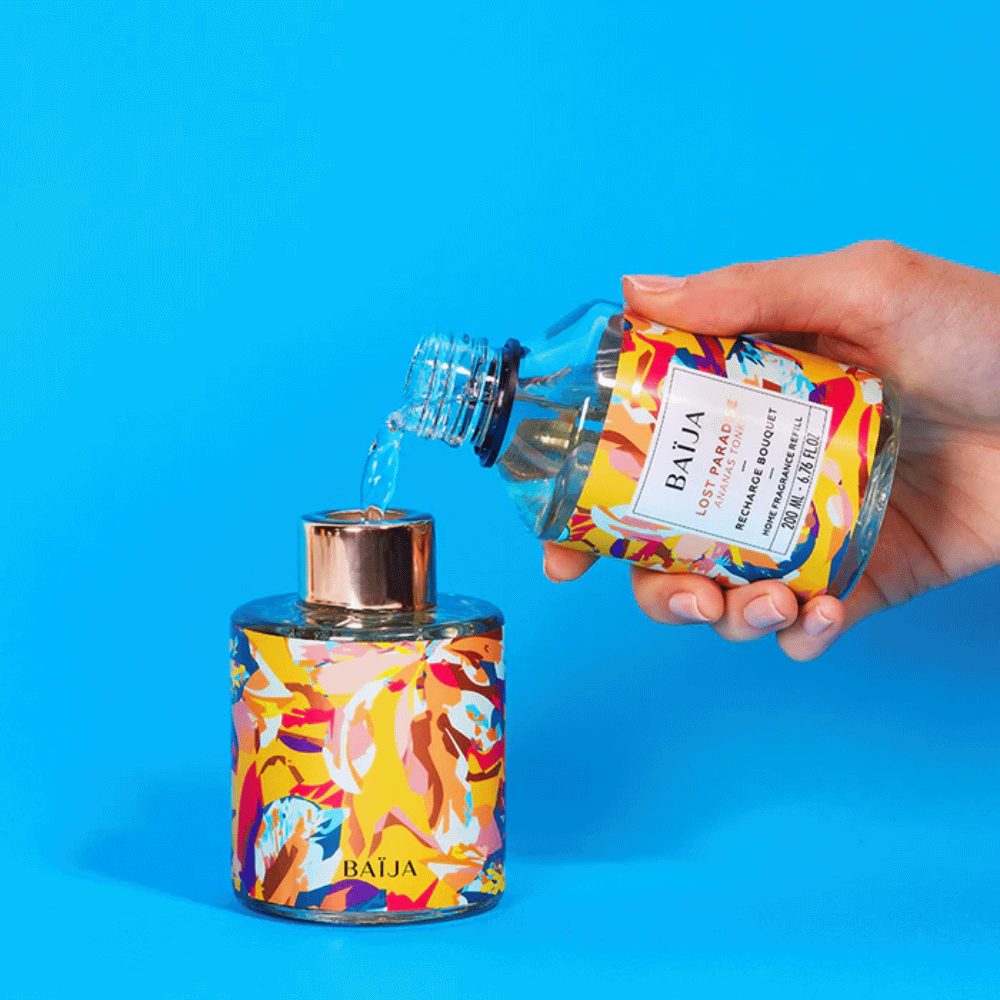 - Gently remove the cap and slowly pour the perfume into the bottle holding the rattan sticks.