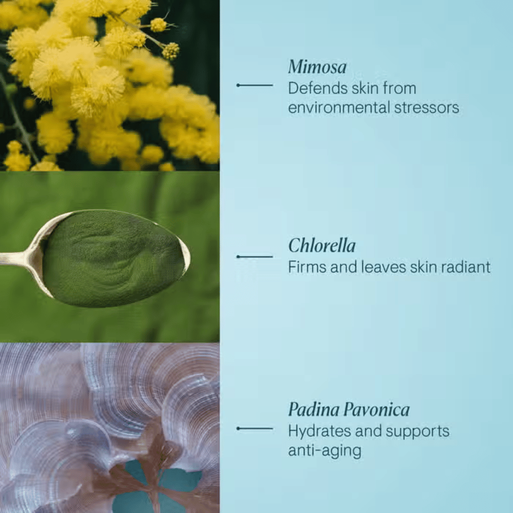Aqua/Water/Eau, Glycerin, Caprylic/Capric Triglyceride, Glyceryl Stearate SE, Isononyl Isononanoate, Dicaprylyl Carbonate, Dimethicone, Phenoxyethanol, Polyacrylate-13, Cetyl Alcohol, Stearic Acid, Tocopheryl Acetate, Coco-Caprylate, Xanthan Gum, Polyisobutene, Fragrance (Parfum), Tocopherol, Butyrospermum Parkii (Shea) Butter, Chlorphenesin, Triticum Vulgare (Wheat) Germ Oil, Chlorella Vulgaris Extract, Glyceryl Polyacrylate, Daucus Carota Sativa (Carrot) Root Extract, Glyceryl Acrylate/Acrylic Acid Copolymer, Disodium EDTA, Padina Pavonica Thallus Extract, Sodium Dehydroacetate, Polysorbate 20, Sorbitan Isostearate, Ginkgo Biloba Leaf Extract, Porphyridium Cruentum Extract, Mimosa Tenuiflora Bark Extract, Rosa Damascena Flower Extract, Collagen Amino Acids, Linalool, Citronellol, Leuconostoc/Radish Root Ferment Filtrate, Potassium Sorbate, Sodium Benzoate, Limonene, Geraniol, Citric Acid.